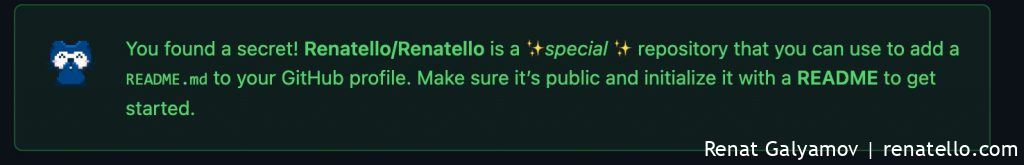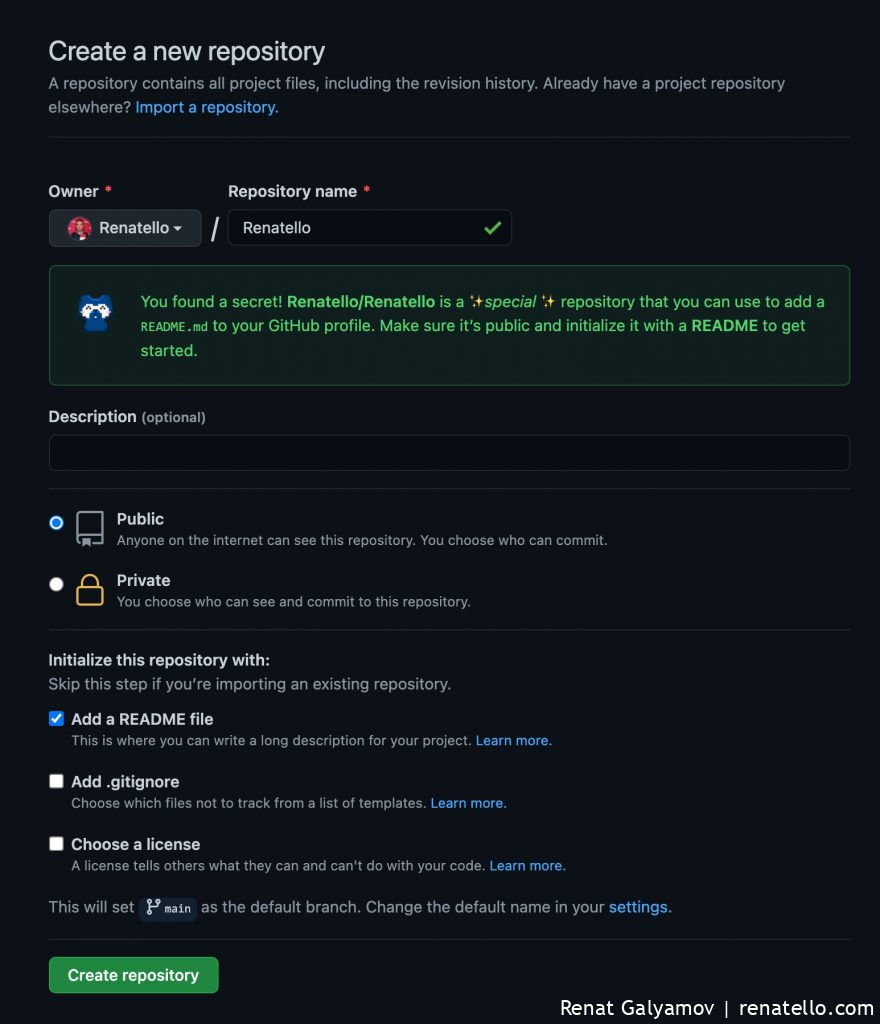 Create a public repository that matches your GitHub username. E.g. username is ‘Renatello’.